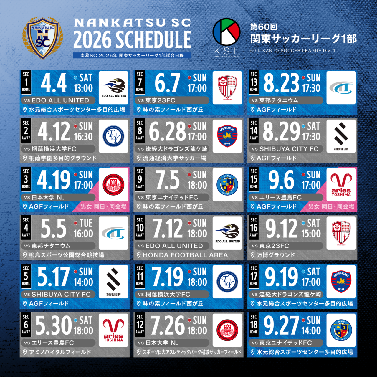 南葛SCは、サッカー漫画『キャプテン翼』の主人公・大空翼が所属するチームと同名の社会人サッカークラブ。原作者である高橋陽一氏がクラブの代表を務め、“葛飾からJリーグへ”をテーマに活動しています。