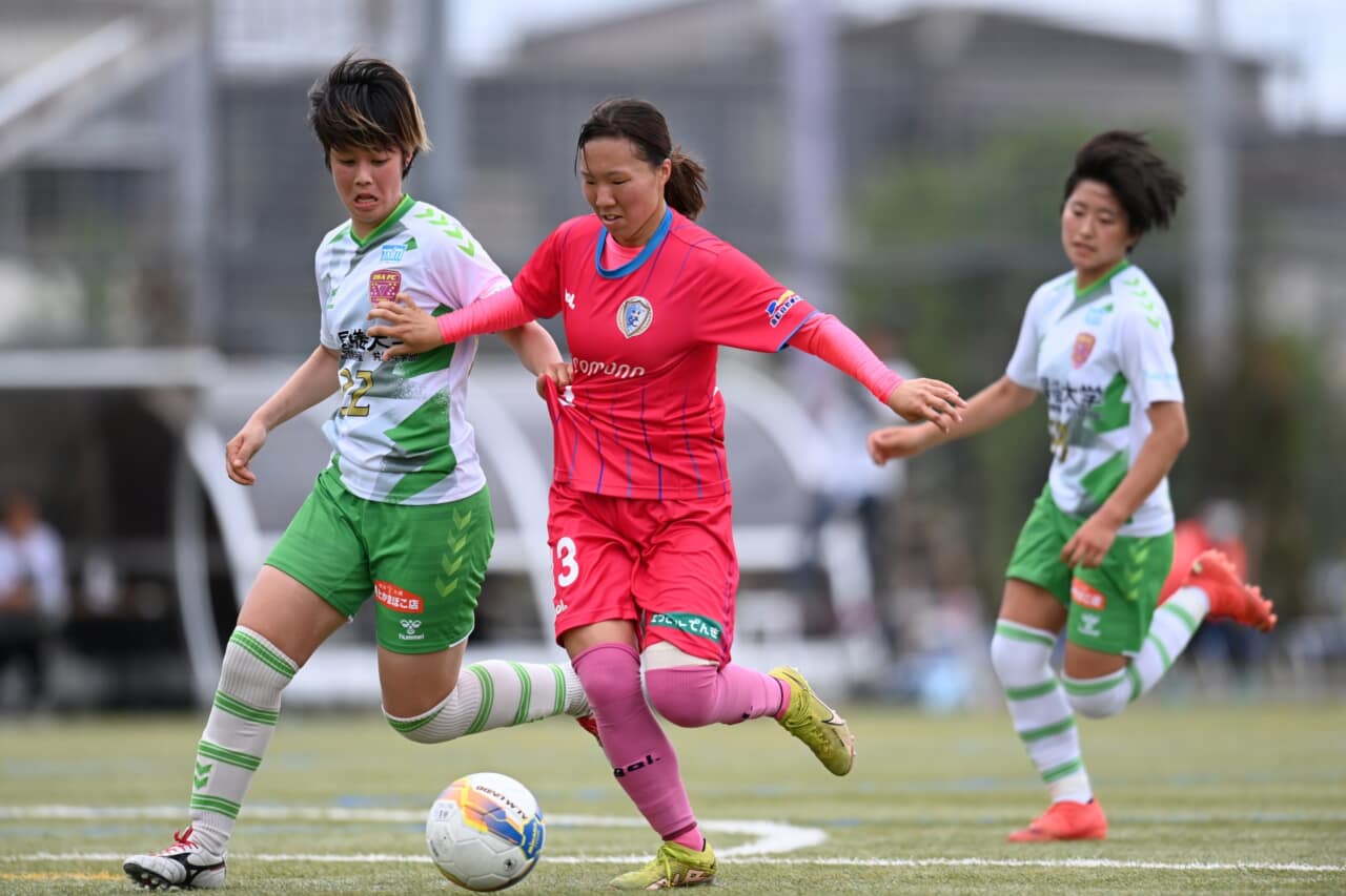 最終ラインの中央では、センターバックの鈴木紋伽と相田さくらが高さや強さ、読みの鋭さを存分に生かし、文字どおり“壁”として立ちはだかった。ビルドアップ時には、ボランチの菅野永遠が鈴木と相田の間で、守護神の高橋純佳、両サイドバックの堤夏穂と人見のどかからボールを受けてパスワークの出発点となった。菅野が意図的にポジションを下げることで空いた中盤のスペースは、小島さつきが適切な位置取りでバランスを取る。
