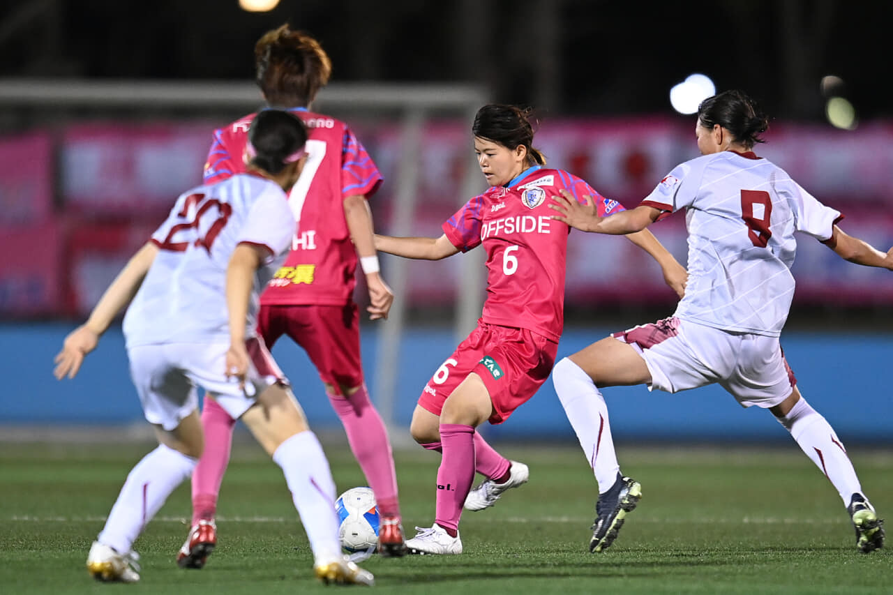 強風がピッチに吹き込み、ボールコントロールの難しい状況の中で、先制はWINGS前半21分。右サイドをドリブルで駆け上がったSB堤夏穂がセンタリングを上げる。これをFW広瀬永里香が折り返し、フリーのMF石倉花純がヘディングで決めた。