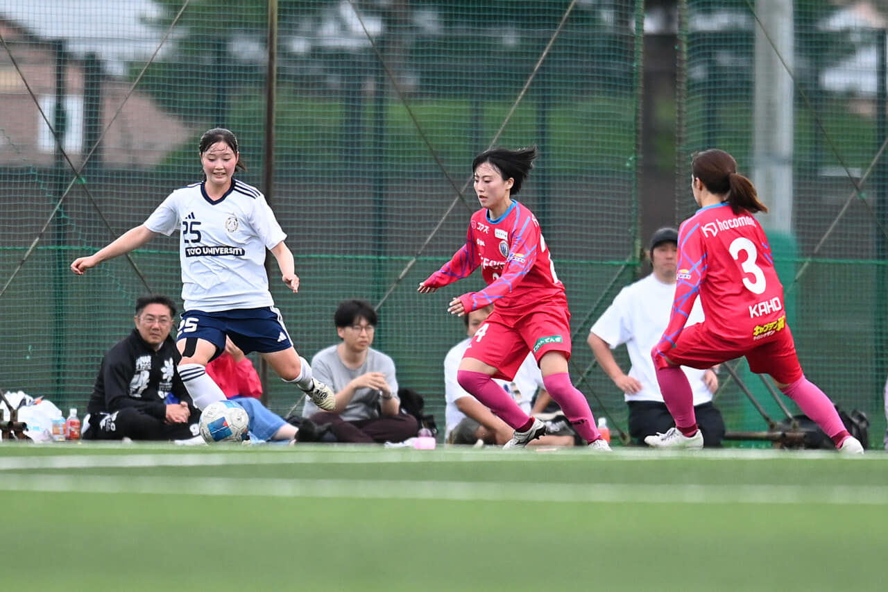 試合はホームの東洋大学が開始から果敢に攻撃を仕掛ける一方、WINGSはボランチの呉娟花がボールを奪うと、中盤から細かくパスを繋いで攻め込む。しかし、フィニッシュまでが遠く、石倉花純からのパスを受けた堤がゴール前に侵入して右足を振ったファーストシュートが前半34分。その後、少しずつ決定機を作り出すが、得点には至らず後半に折り返した。