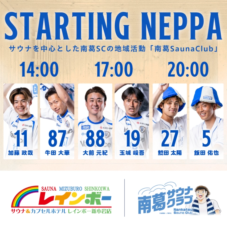南葛SCの地域密着型サウナ活動「南葛サウナクラブ」は、12月9日(火)にサウナレインボー新小岩店にて「南葛熱波」を実施します。当日は選手が熱波師としてサウナ室に登場し、特製バスタオルを使った“爆風熱波”で利用者のみなさまをととのえます。