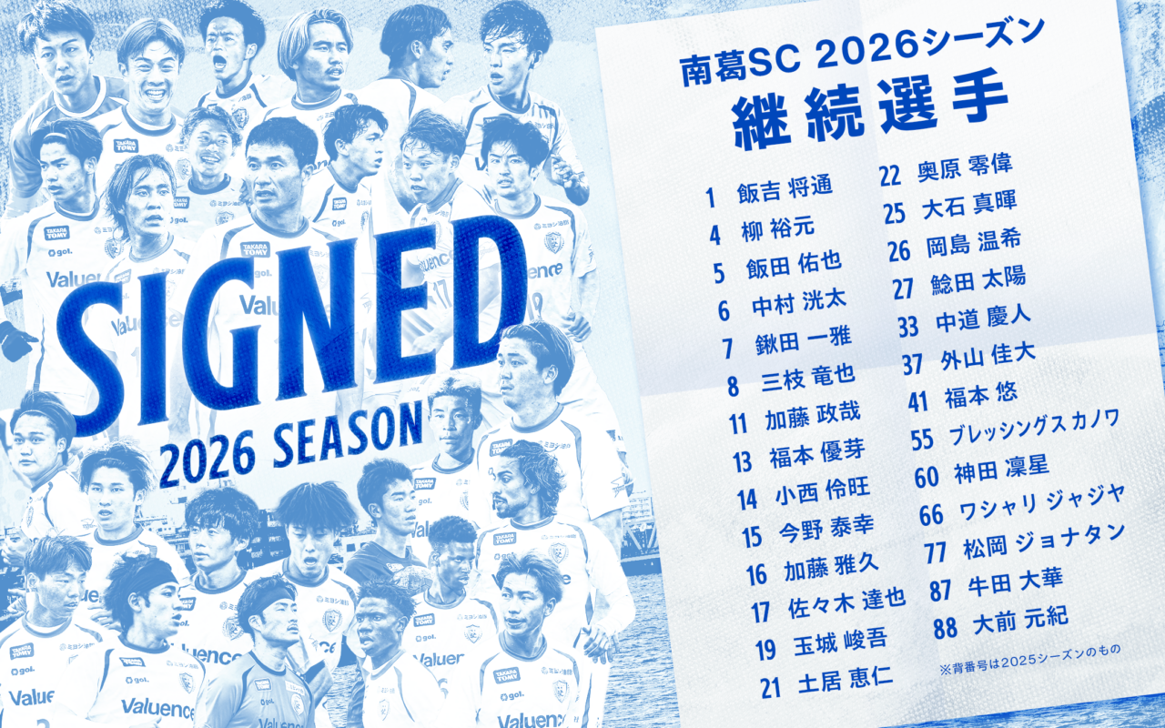 このたび、南葛SCは、以下27選手が2026シーズンも引き続き南葛SCでプレーすることが決定しましたので、お知らせいたします。