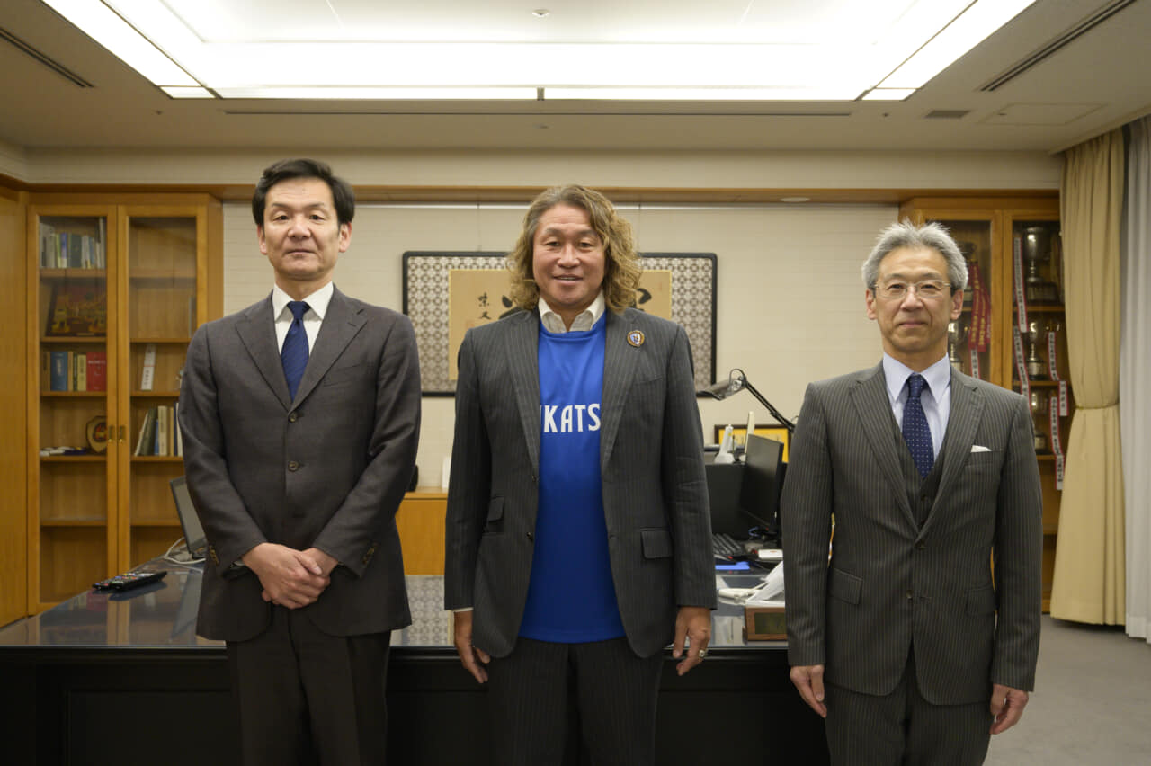 ▶左から東京拘置所・竹内総務部長、南葛SC・岡野雅行、東京拘置所・山本所長