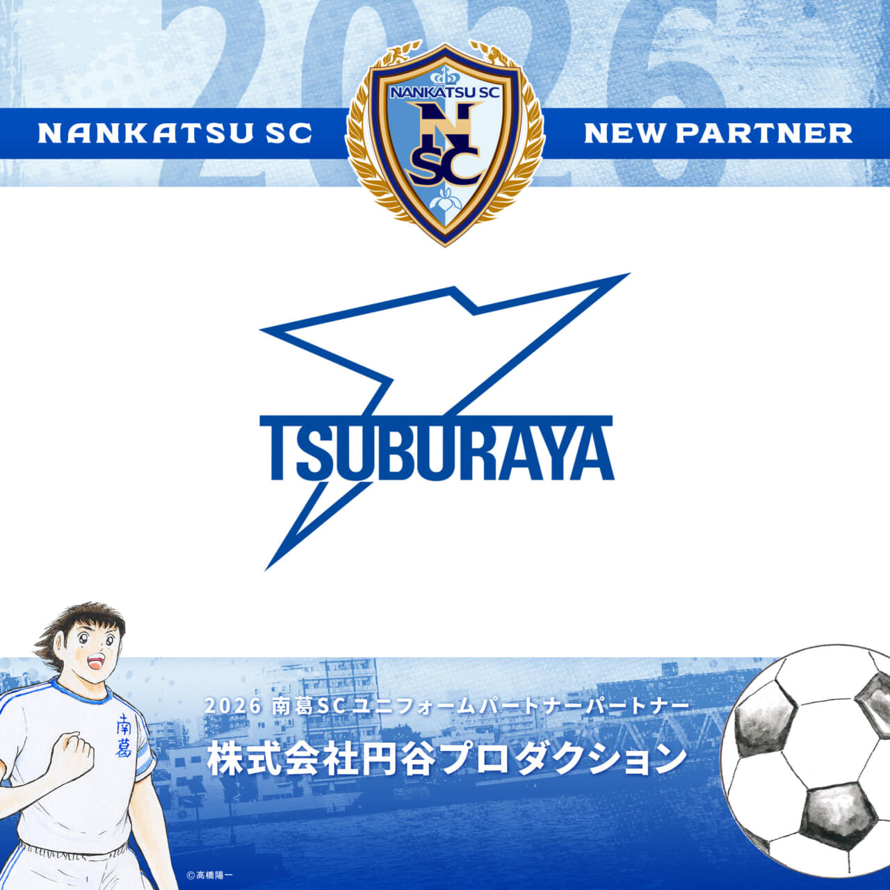 南葛SCは、株式会社円谷プロダクション様と、2026シーズンのパートナー契約を更新いたしましたのでお知らせします。株式会社円谷プロダクション様のロゴが、ホームユニフォームに掲出されます。