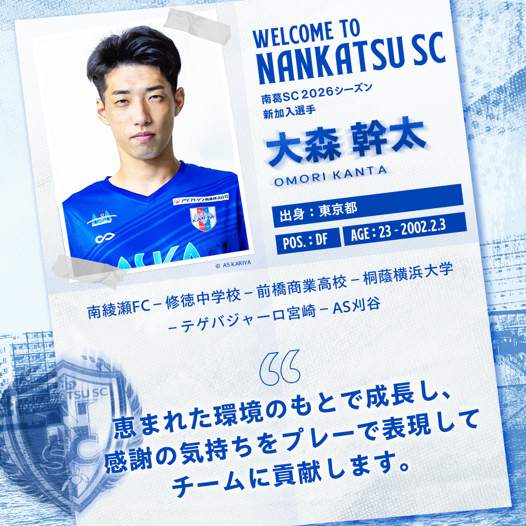 このたび、大森 幹太(おおもり かんた)選手が南葛SCへ加入することが決まりましたので、お知らせいたします。