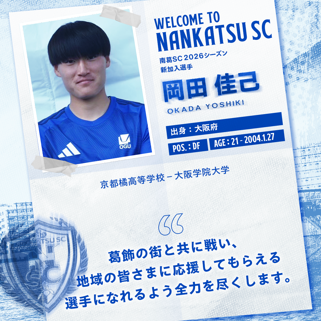 このたび、岡田 佳己(おかだ よしき)選手が南葛SCへ加入することが決まりましたので、お知らせいたします。