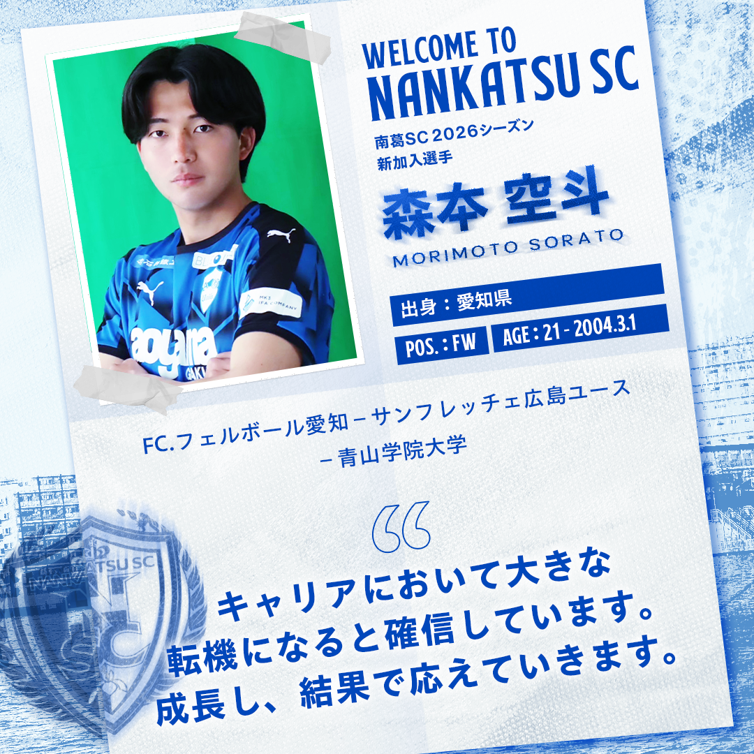 このたび、森夲 空斗(もりもと そらと)選手が南葛SCへ加入することが決まりましたので、お知らせいたします。