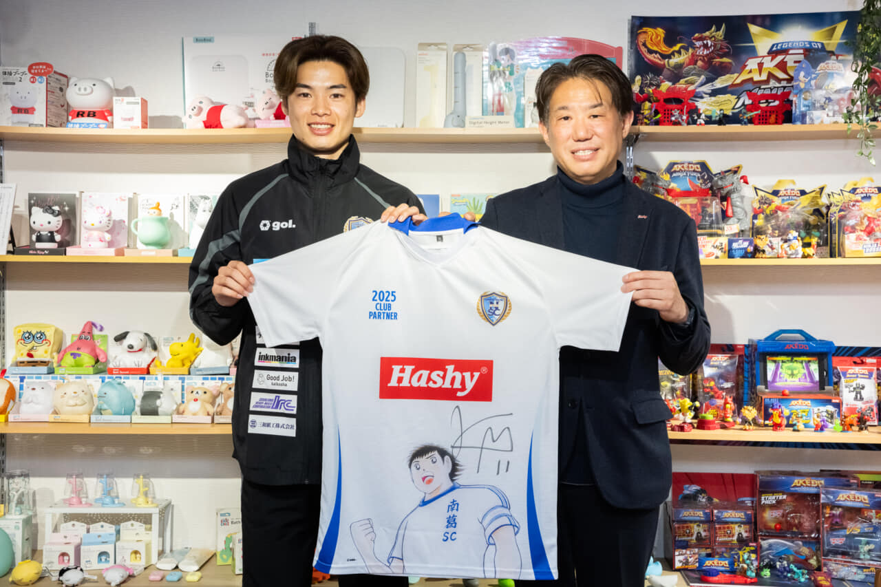 南葛SCのパートナーとして、チームとともに戦ってくれている企業をピックアップ。今回は、2025シーズンよりパートナー契約を締結した株式会社ハシモトを紹介します。まもなく創立100周年を迎える企業のこれまでの歩み、玩具業界の現在地と今後の展望、社長が提示する“6つの行動指針”などについて、営業担当の加藤政哉(FW 11)も同席の上、橋本貴裕代表取締役に話を聞きました。