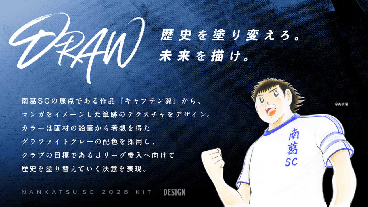 南葛SCの原点である作品『キャプテン翼』から、マンガをイメージした筆跡のテクスチャをデザイン。カラーは画材の鉛筆から着想を得たグラファイトグレーの配色を採用し、クラブの目標であるJリーグ参入へ向けて歴史を塗り替えていく決意を表現。