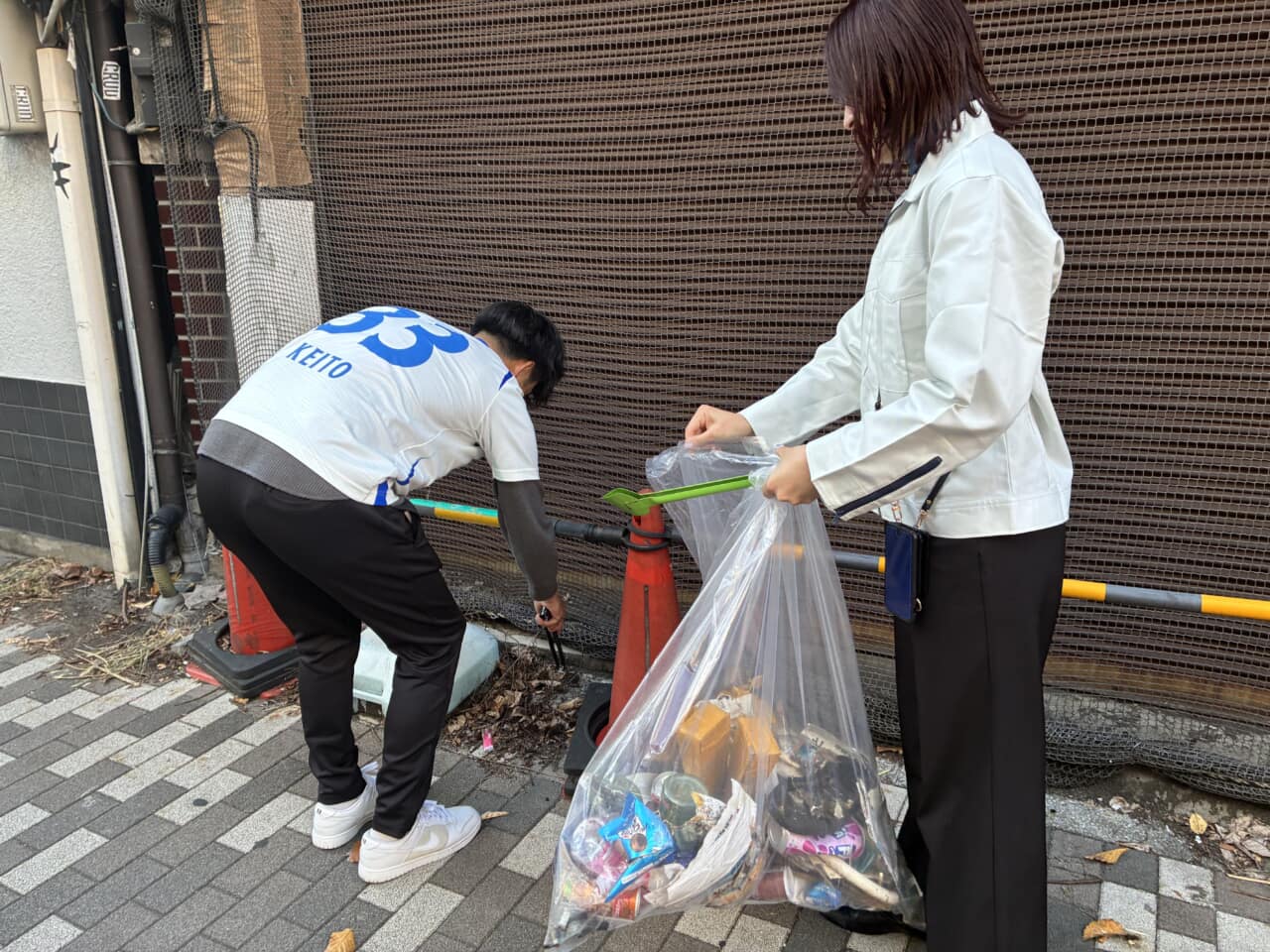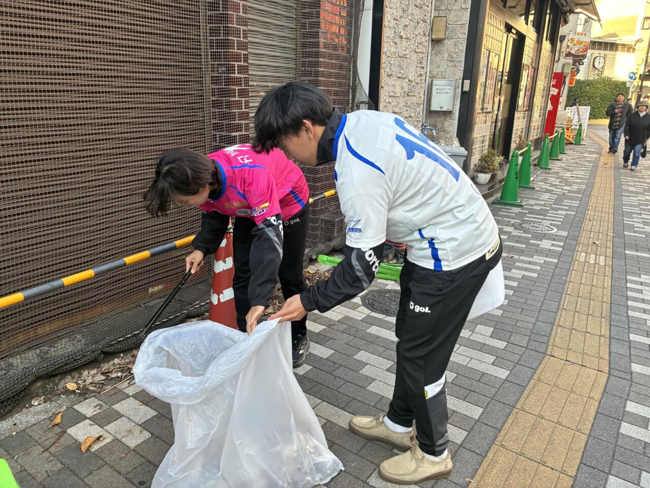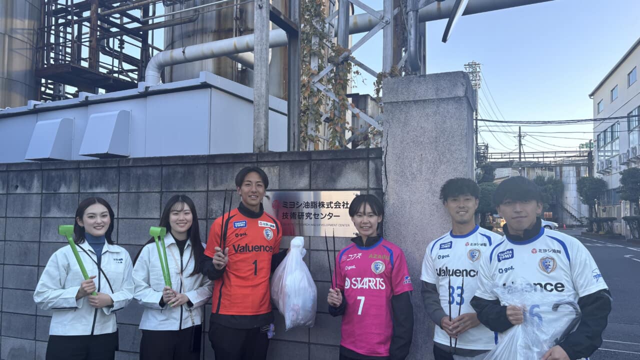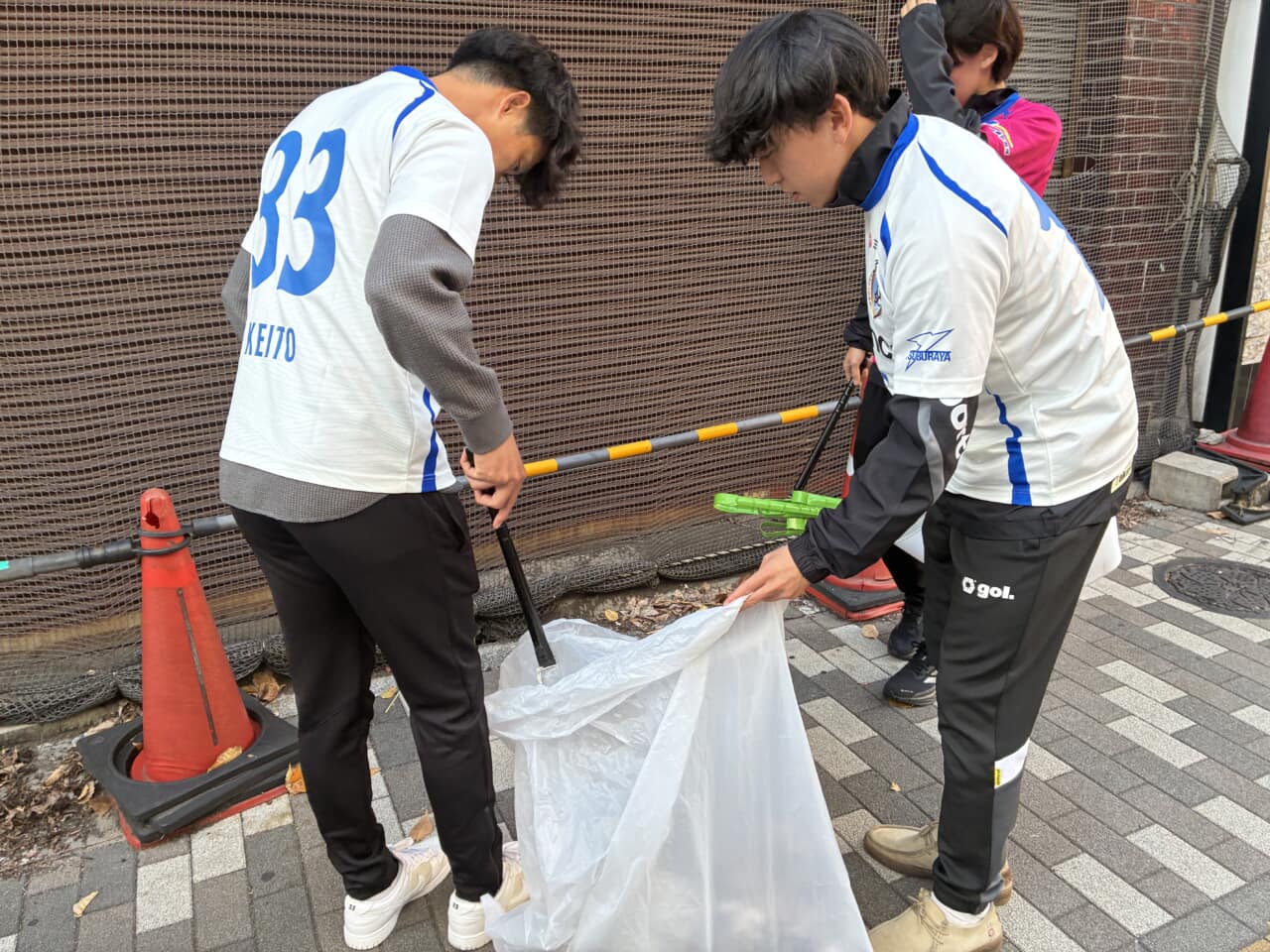 南葛SCは、ミヨシ油脂株式会社様と共同で、南葛SCのホームタウンでありミヨシ油脂の技術研究センターがある葛飾区において環境改善活動を実施しました。2025年11月28日(金)には、堀切菖蒲園駅周辺にて清掃活動を行い、今回で3回目となる本取り組みには、南葛SC所属選手およびミヨシ油脂社員あわせて6名が参加しました。活動当日は、道端に落ちている空き缶やペットボトル、たばこの吸い殻、放置された傘などを回収し、地域の美化に努めました。
