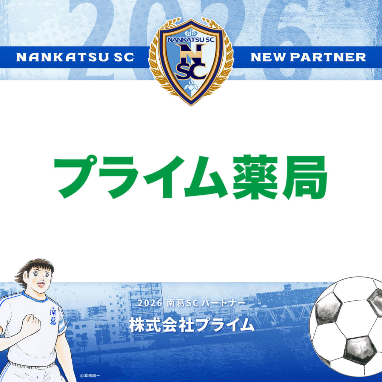 2015シーズンよりユニフォームパートナーとして、南葛SCをご支援いただいております『株式会社プライム』様と、2026シーズンのパートナー契約を更新いたしましたのでお知らせします。プライム薬局様のロゴは、ホームユニフォームパンツ裏面に掲示されます。