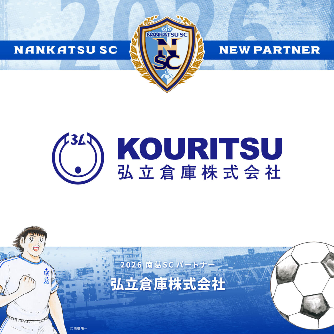 パートナーとして南葛SCをご支援いただいております弘立倉庫株式会社様と、2026シーズンのパートナー契約を更新いたしましたのでお知らせします。弘立倉庫株式会社様のロゴが、南葛SC練習着背面、南葛SC WINGSユニフォームパンツ前面に掲出されます。