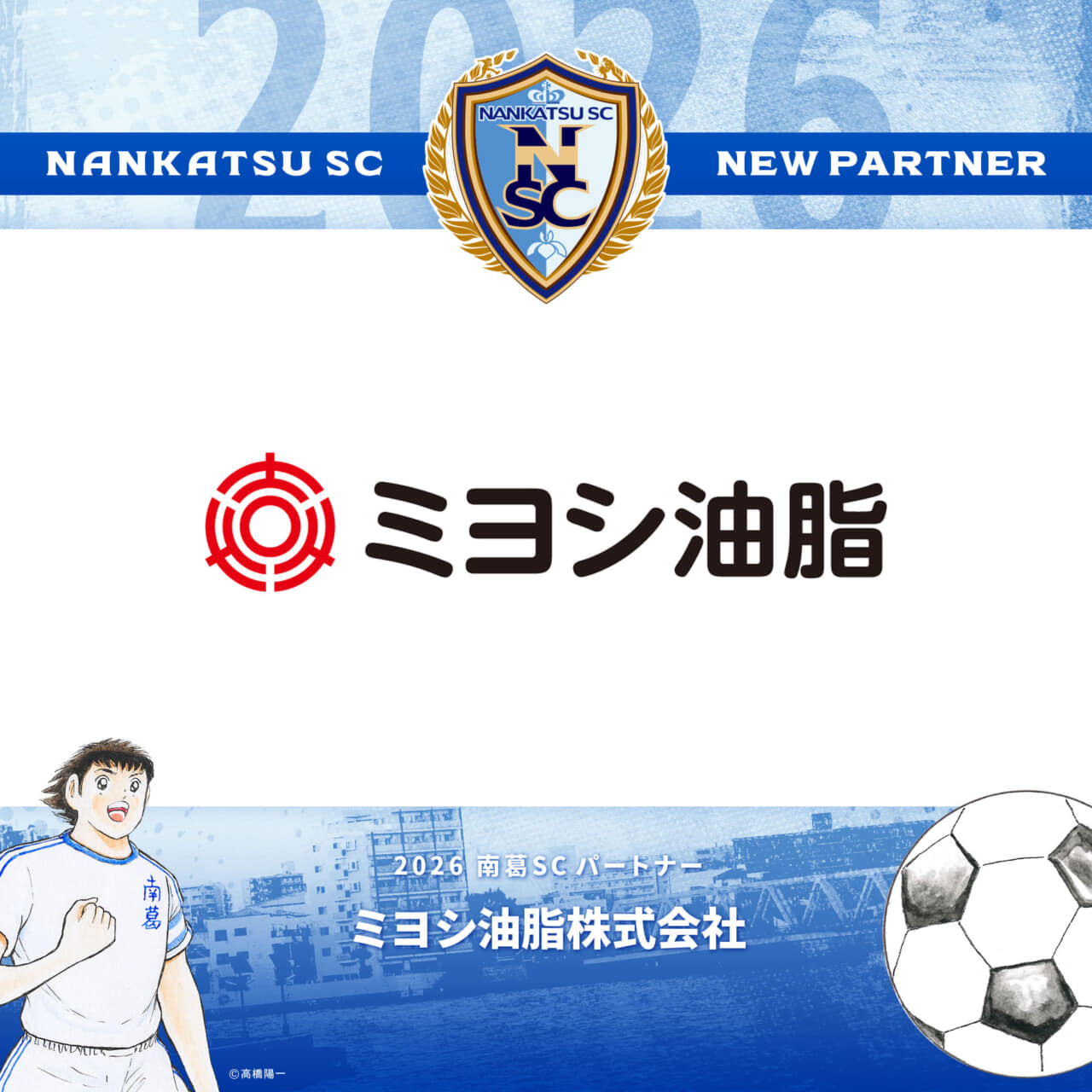 葛飾区を代表する上場企業であるミヨシ油脂さんとは、南葛SCの数あるパートナー企業の中でも異例の5年契約を結んでいただいています。昨シーズンは例年実施させていただいている地元での清掃活動に加え、本社オフィスでの交流会も実施、より多くのミヨシ油脂さんの社員の方々に応援していただいていることを実感しています。契約3年目となる2026シーズンは、ぜひともJFL昇格を成し遂げ、皆さんと一緒に喜びを分かち合いたいです。もちろん、地域を盛り上げる活動も引き続きともにやっていければと思います。