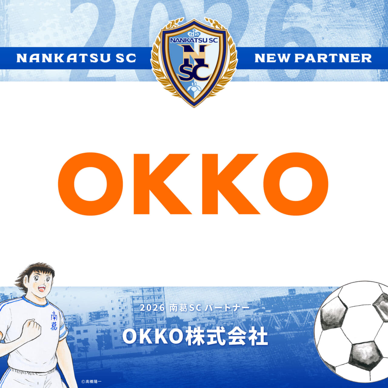 2022シーズンよりパートナーとして、南葛SCをご支援いただいておりますOKKO株式会社様と、2026シーズンのパートナー契約を更新いたしましたのでお知らせします。ボランティアビブス、応援ハリセンにOKKO株式会社様のロゴが掲出されます。