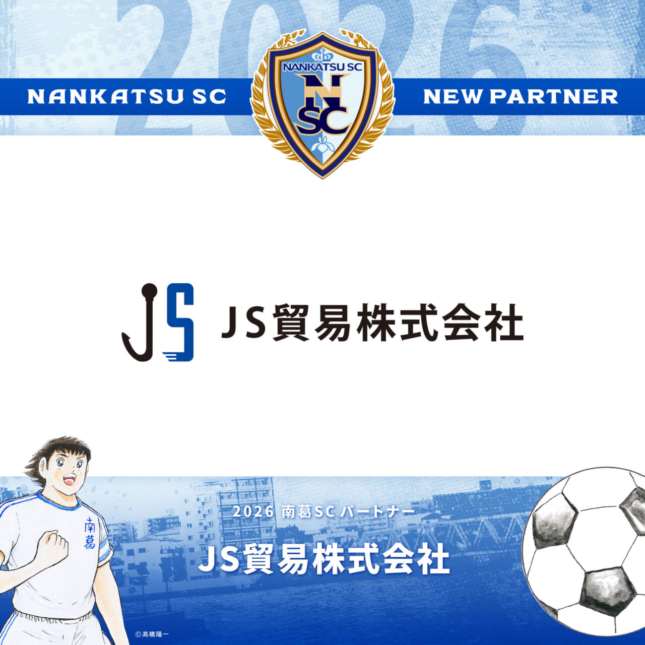 2024シーズンよりパートナーとして、南葛SCをご支援いただいておりますJS貿易株式会社様と、2026シーズンのパートナー契約を更新いたしましたのでお知らせします。JS貿易株式会社様のロゴは、トップチーム練習着袖部分に掲出されます。