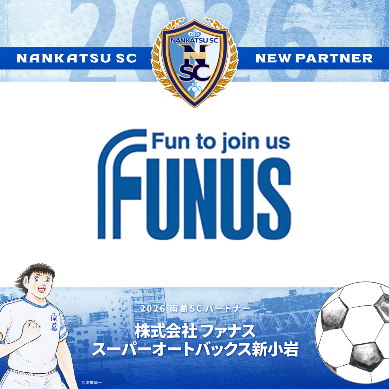 2023シーズンよりパートナーとして、南葛SCをご支援いただいております株式会社 ファナス「スーパーオートバックス新小岩」様と、2026シーズンのパートナー契約を更新いたしましたのでお知らせします。