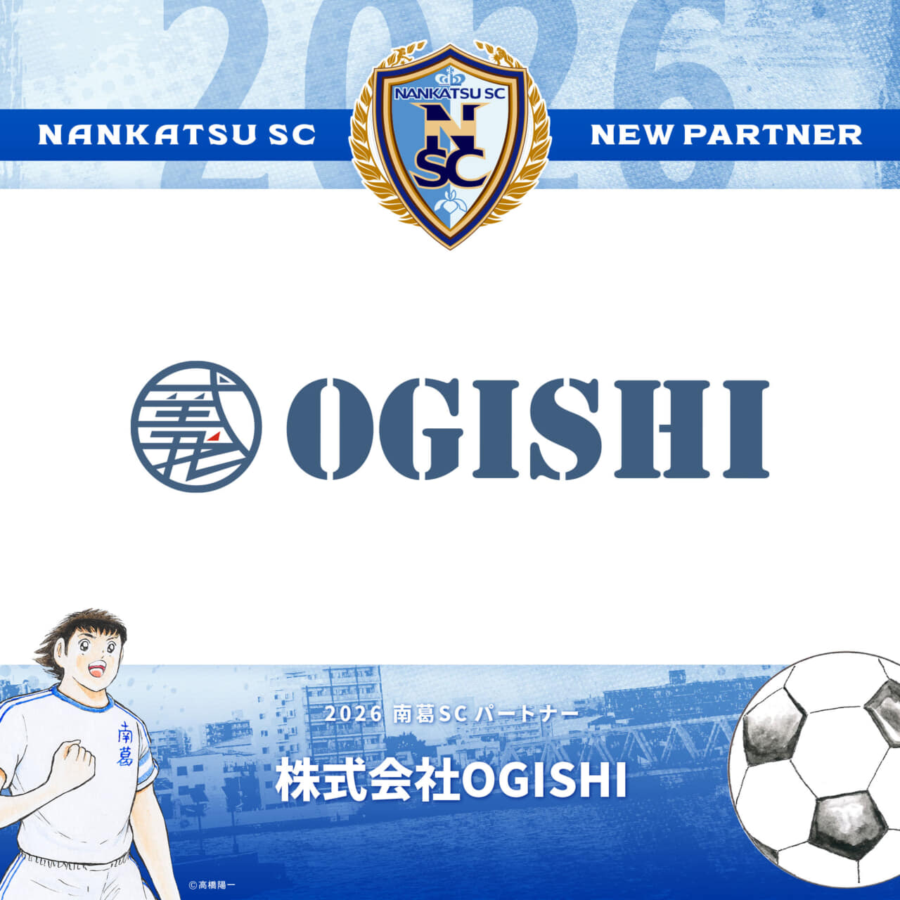 2025シーズンよりパートナーとして、南葛SCをご支援いただいております株式会社OGISHI様と、2026シーズンのパートナー契約を更新いたしましたのでお知らせします。株式会社OGISHI様のロゴは、トップチームアウェイユニフォームパンツ背面に掲出されます。