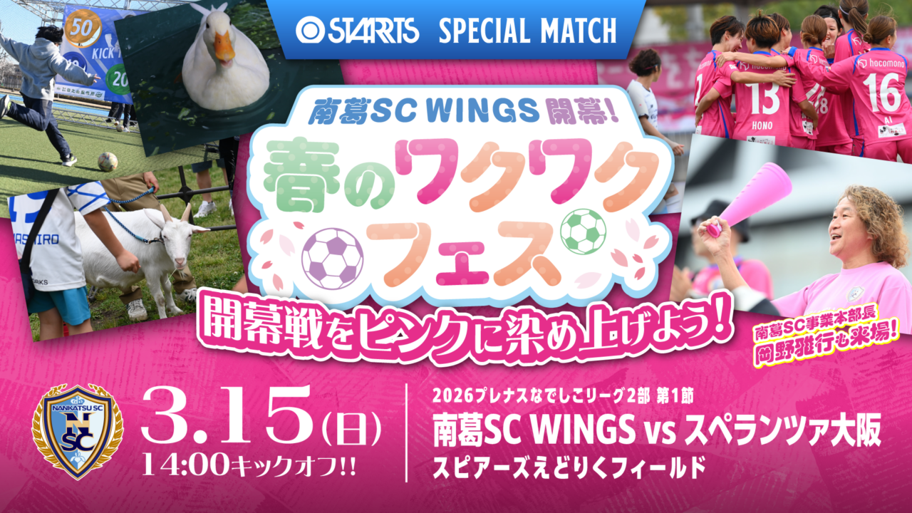 3月15日(日)(11時イベント開始、14時キックオフ)に開催する2026プレナスなでしこリーグ2部 vs スペランツァ大阪(スピアーズえどりくフィールド)において、南葛SCのパートナーであるスターツグループのご協力のもと、冠マッチ『スターツ スペシャルマッチ』を開催いたします。
