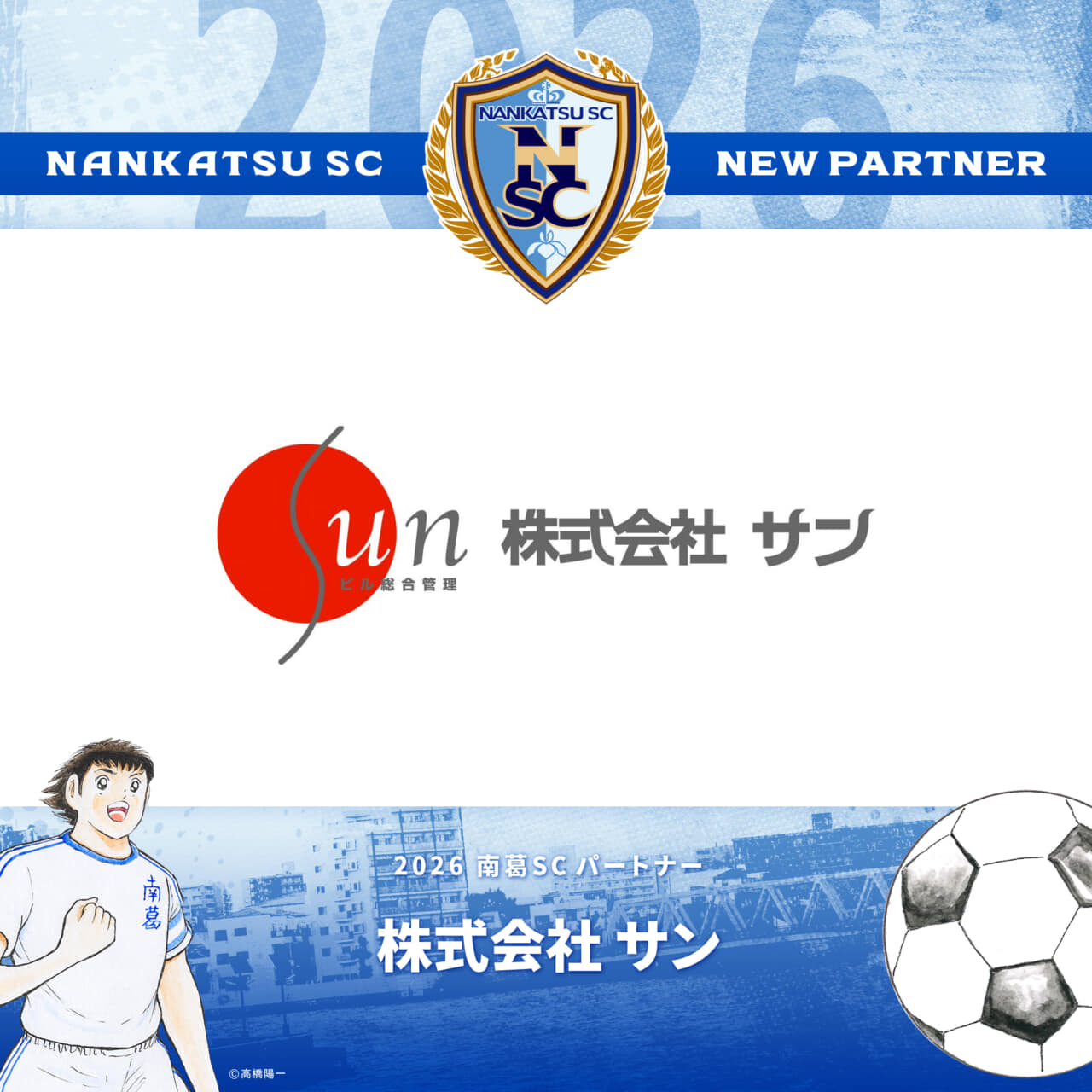2025シーズンよりパートナーとして、南葛SCをご支援いただいております株式会社サン様と、2026シーズンのパートナー契約を更新いたしましたのでお知らせします。株式会社サン様のロゴは、トップチームの試合ライブ配信時に掲出されます。