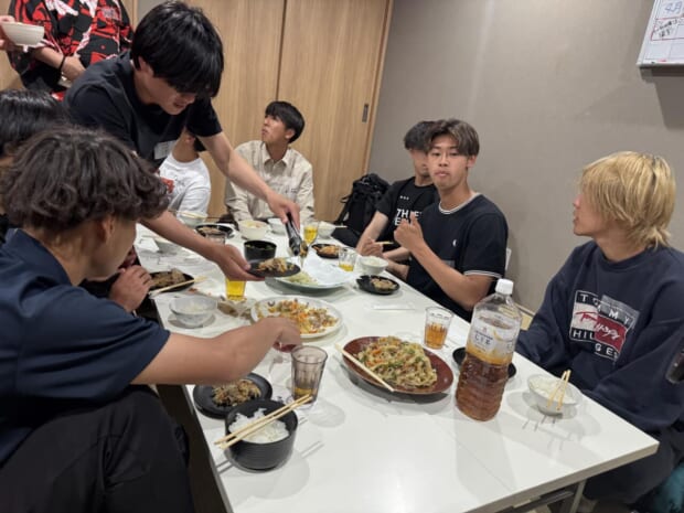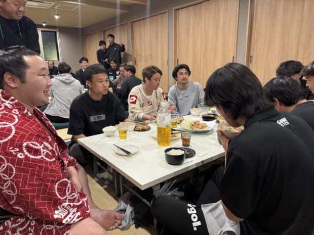 南葛SCからは、風間八宏監督をはじめとするコーチ陣、選手、フロントスタッフ総勢28名が参加。大島部屋特製の塩ちゃんこをはじめとした料理を囲み、和やかな時間を過ごすとともに、次戦に向けて英気を養いました。
