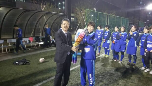 11/1、大一番に向けての最後の調整練習を行ったこの日、WINGSオフィシャルスポンサーのカインズグループの代表、金子高一郎様をはじめグループの社員の皆様がグランドに激励に来てくださいました。